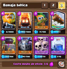 ESPECIALES: BOLA DE FUEGO 4, MINI P.E.K.K.A 4, MOSQUETERA 4, GIGANTE 5, CHOZA DE DUENDES 5, VALQUIRIA 4, LÁPIDA 3, TORRE BOMBARDERA 5, COHETE 6, CHOZA DE BÁRBAROS 7, TORRE INFERNAL 5, MONTAPUERCOS 4, HORNO 4, MAGO 5, RECOLECTOR DE ELEXIR 6, ARIETE DE BATALLA 5, TRÍO DE MOSQUETERAS 9, MEGAESBIRRO 3, GOLEM DE HIELO 3, LANZADARDOS 3, CURACIÓN ?.